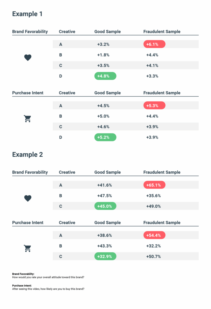 For instance, fraudulent or unacceptable quality users scored an ad with a brand favorability score +6.1% whereas quality users scored that +3.2%, creating an overall score of +4.3%. By including bots and fraudulent users, the company would select this as the top-performing ad. But if you removed those false results, it was actually the third-worst performing ad out of four.